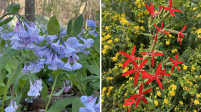 Pictured above: (L-R) Virginia Bluebells (Mertensia virginica). Royal Catchfly (Silene regia) and Shrubby St. John’s…