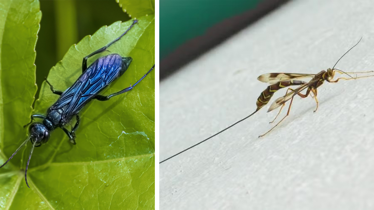 The stunning, half inch blue mud dauber (Chalybion californicum) on the left is a solitary wasp which will only sting if harassed. On the other hand, the long-tailed giant ichneumon wasp (Megarhyssa macrurus
