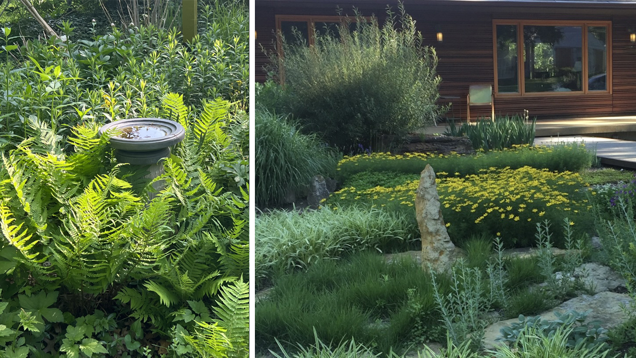 Above L-R: Kathy’s woodland melange of fern, geranium and asters; the Japanese-inspired horizontal geometry of Karen L.’s front yard grid