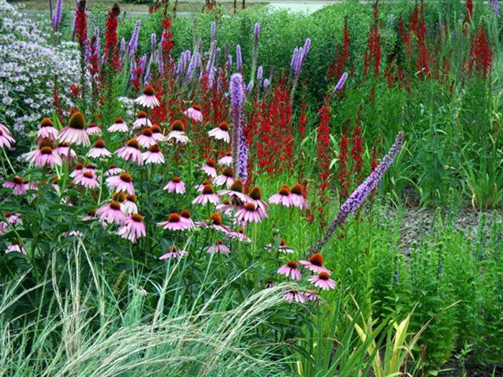 For some summer lovin’, try Valentine-inspired colors in the heat of July and August. Here, cardinal flower (Lobelia cardinalis) mingles with purple coneflowers (Echinacea purpurea), while a Liatris and bee balm (Monarda fistulosa) flirt around the edges. Relationships are so complicated…