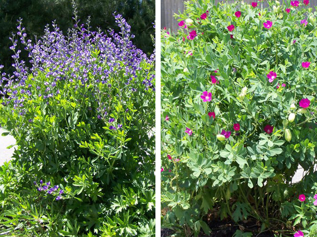 Another interesting power couple is purple poppy mallow (Callirhoe involucrata) and blue wild indigo, (Baptisia australis). Shown here with two wild indigo planted in one hole while the poppy mallow vines and intertwines. They each get their time to shine, with the indigo’s purple giving way to the poppy mallow’s fuchsia as spring turns to summer.