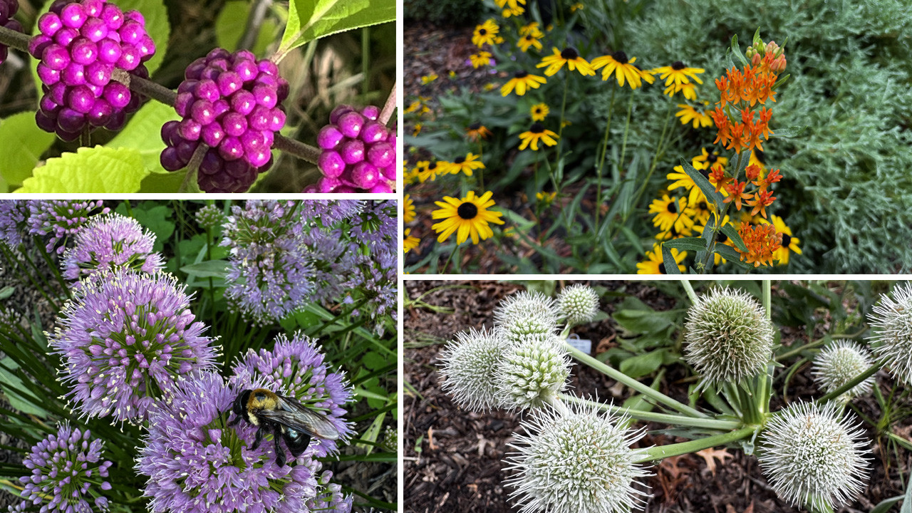 Photos: Top Left: Anna Graether, American Beautyberry. Bottom Left: Cydney Ross, Allium, Top Right: Cydney Ross, Black-eyed Susan, Bottom Right: Cydney Ross, Rattlesnake Master