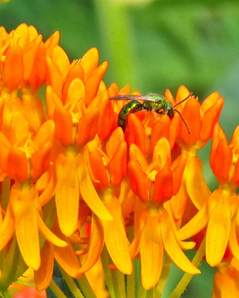 We grow native plants for their beauty but also to observe the fascinating creatures visiting them. Visiting our flowers this summer are the green gems of the native bee world, the Metallic Green Sweat Bees. These harmless, eighth to half inch size, bees live out their entire lives in your yard and need your help to survive. They provide not only pollenating services but beauty and interest in the garden.