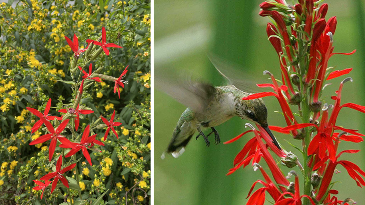 Pictured above: Royal Catchfly and Shrubby St. John’s Wort (left); Ruby-throated Hummingbird (Archilochus colubris) on Cardinal Flower (Lobelia cardinalis). Photograph by Bill Buchanan for US Fish and Wildlife Service.
