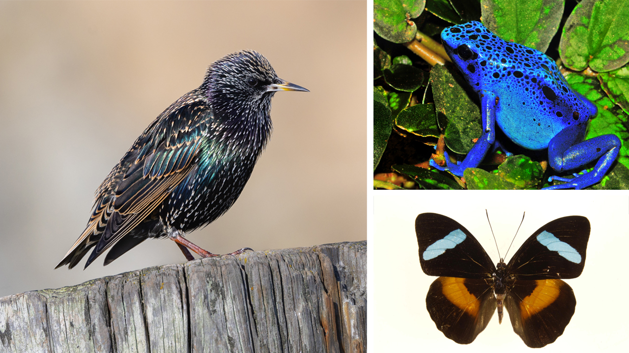 Pictured above: European Starling (Sturnus vulgaris). Photograph by Frank Schulenburg via Wikimedia Commons; Blue Poison Dart Frog (Dendrobates tinctorius azureus). Photograph by Michael Gäbler via Wikimedia Commons; Olive-wing Butterfly (Nessaea obrinus). Photograph by Notafly via Wikimedia Commons.