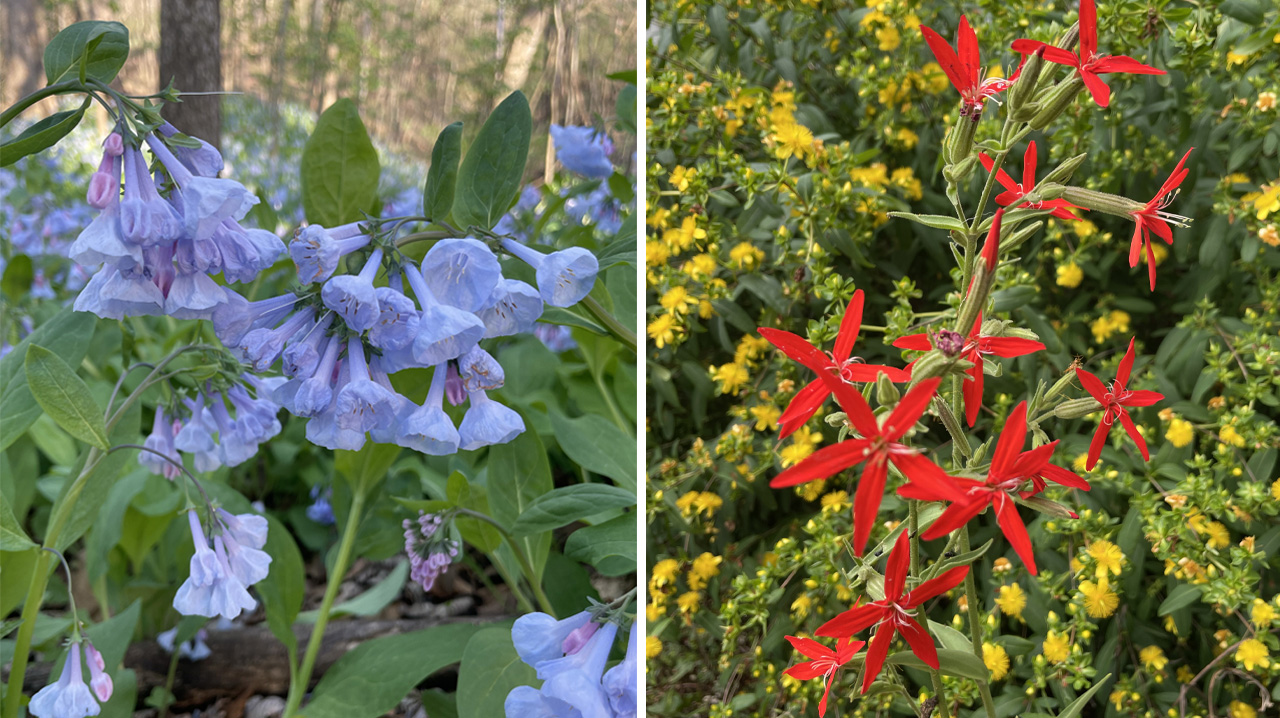 Pictured above: (L-R) Virginia Bluebells (Mertensia virginica). Royal Catchfly (Silene regia) and Shrubby St. John’s Wort (Hypericum prolificum). Photographs by Cydney Ross.