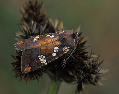 Starting off with Rattlesnake Master (Eryngium yuccifolium), this tall perennial with globular flower heads blooms from June through August. Viewed from afar, its unique structure adds architectural interest to any garden. It isn’t until we move closer that we recognize the impressive density of flowers coating each bulb. The feast of pollen provided by these flowers is beloved by bees and supports a wide variety of pollinators. Rattlesnake Master is a host plant for various species including the rattlesnake master stem borer moth (Papaipema eryngii) (photo credit: USDA Forest Services) and the recognizable black swallowtail butterfly (Papilio polyxenes).