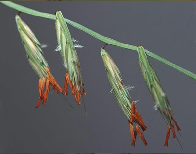 Sideoats Grama produces oat-like seeds that hang from one side of each stem. During its blooming season, the stamens (pollen-producing, male reproductive part) emerge from the seeds and are bright orangish-red in color. You may also spot the stigmas (pollen- accepting, female reproductive part), which surface on the sides of the seeds and have a white, feather-like appearance. Pollination for this grass, as with most, occurs through anemophily, which means their pollen is carried by the wind. If you gently tap on a blooming stem, you may see a cloud of pollen leave the stamens and drift away, hopefully reaching the stigmas of another plant!
